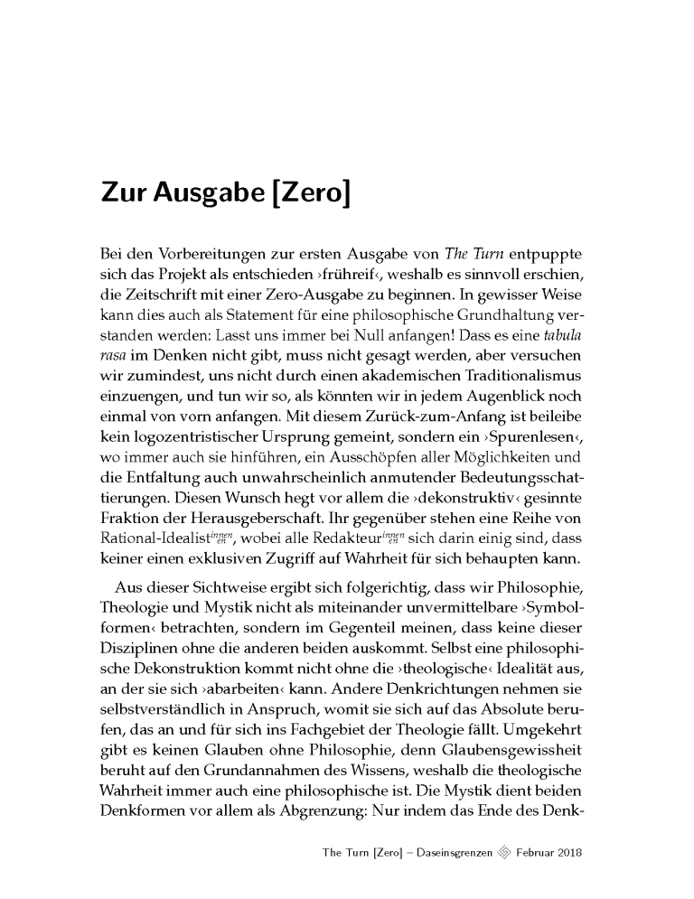 Unter dem Thema ›Daseinsgrenzen‹ geht es in dieser Debüt-Ausgabe von The Turn um neue und offene Horizonte des Denkens, welches das Fremde und Andere zum Anlass nimmt, die eigenen Daseinsgrenzen zu verstehen und aus diesem Verständnis heraus neue Betrachtungs- und Erkenntniswege zu gehen.